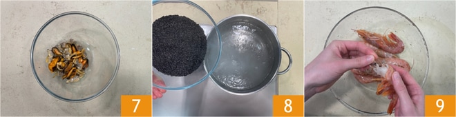 Reserve os frutos do mar 7. Cozinhe o arroz venere em bastante água salgada por 20 minutos 8. Limpe os camarões removendo a cabeça e a carapaça 9.
