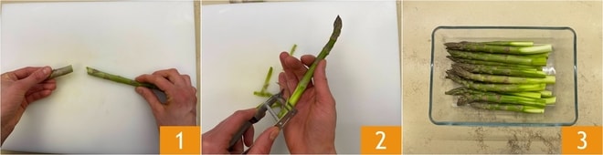 Para preparar os aspargos na frigideira, comece pela Como limpar os aspargos: lave-os bem, depois quebre-os com as mãos para eliminar a parte mais clara e fibrosa do talo, mantendo-se ligeiramente abaixo do ponto onde o aspargo tende a dobrar 1. Com um descascador, descasque a parte final do aspargo 2. Coloque-os em uma tigela e proceda dessa forma para todos os outros 3.