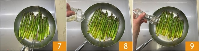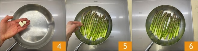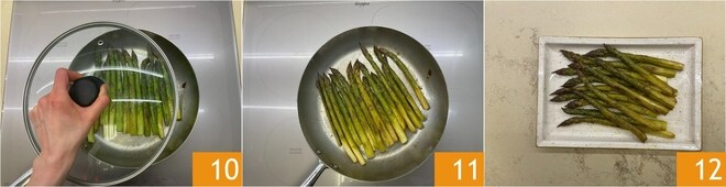 Cubra com uma tampa 10 e abaixe ligeiramente o fogo. Cozinhe por cerca de 20 minutos até que fiquem macios 11, depois sirva seus aspargos na frigideira 12!