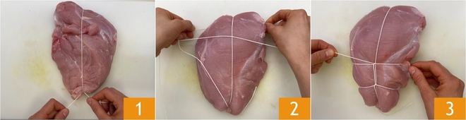 Para preparar o assado com cogumelos, primeiro amarre o peito de peru com o barbante de cozinha: amarre o pedaço de carne ao longo e faça um nó duplo em uma extremidade 1, depois passe o fio por baixo 2 e crie uma laçada. Proceda desta forma 3 até chegar à outra extremidade e fixe o barbante com outro nó duplo. Para todos os detalhes, leia nossa ficha "Como amarrar o assado".