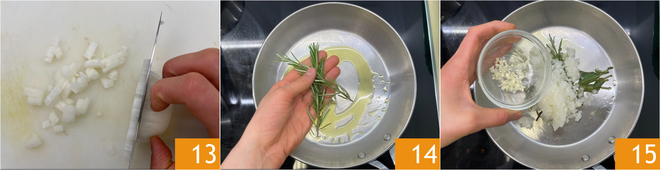 Descasque e pique finamente tanto a cebola 13 quanto o alho 14. Em uma frigideira, aqueça um pouco de óleo com a sálvia e o alecrim 14, depois adicione o alho e a cebola picados 15. Salgue imediatamente e deixe murchar por cerca de 10 minutos.
