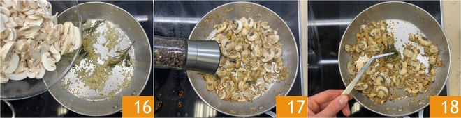 Quando o alho e a cebola estiverem murchos, adicione os cogumelos 16 e refogue em fogo médio por cerca de 5 minutos. No final do cozimento, ajuste o sal e a pimenta 17, depois remova as ervas aromáticas 18.