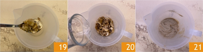 Transfira metade dos cogumelos para um copo medidor 19, despeje 100 g de água 20 e bata com um mixer de imersão até obter um molho liso e homogêneo 21.