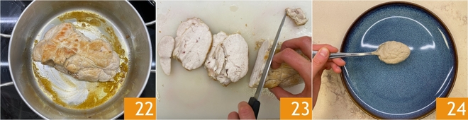 Neste ponto, o assado estará cozido 22, então corte-o em fatias de cerca de meio cm de espessura 23. Você está pronto para colocar no prato: distribua o molho na base do prato 24, depois coloque as fatias de carne por cima.