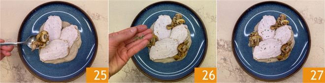 Complete com os cogumelos inteiros 25 e alecrim picado 26. Seu assado com cogumelos está pronto para ser servido 27!