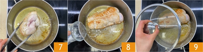 Vire o assado de todos os lados para garantir que esteja bem dourado 7. Neste ponto, despeje 50 g de água 8, abaixe o fogo e cubra com a tampa 9. Cozinhe em fogo baixo por cerca de 25-30 minutos.