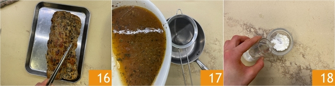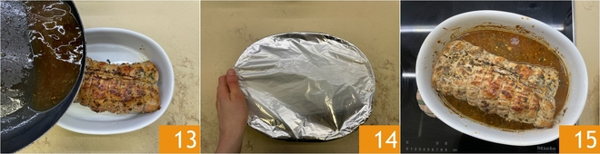 Despeje o fundo de cozimento sobre a carne 13, cubra com papel alumínio 14 e cozinhe por uma hora e meia em forno estático pré-aquecido a 180º, ou até que a carne atinja uma temperatura interna de 70º-75º. Neste ponto, retire o assado do forno 15.