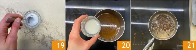 Misture bem para dissolver o amido 19, adicione ao fundo de cozimento 20 e cozinhe por mais alguns minutos até que comece a ferver 21.