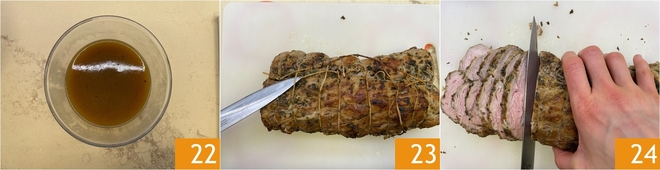 Você deve obter um molho mais espesso, mas ainda assim bastante líquido 22. Se pretende servir o assado imediatamente, retire o barbante da carne 23 e corte-a em fatias 24, depois sirva com o molho.
