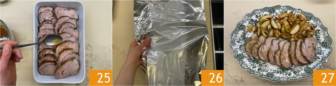 Se desejar servi-lo no dia seguinte, transfira as fatias do assado novamente para a assadeira e regue-as com o molho que você aqueceu para torná-lo líquido novamente 25. Cubra com uma folha de papel alumínio 26 e aqueça tudo em forno estático pré-aquecido a 180º por 15-20 minutos. Após esse tempo, basta servir o seu assado de vitela ao marsala, talvez acompanhado de Batatas assadas 27!