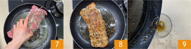 Quando a manteiga estiver derretida, coloque a carne na panela 7 e doure bem de todos os lados 8; isso levará de 5 a 10 minutos. Assim que a carne estiver bem dourada, transfira-a para uma assadeira e colete o fundo de cozimento em uma tigela 9. Eliminando a parte gordurosa, você obterá um molho mais leve.