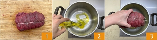 Para preparar o assado na panela de pressão, primeiro pegue o pedaço de carne amarrado 1, caso contrário, leia nosso guia: Como amarrar o assado para fazer você mesmo. Despeje um fio de azeite em uma panela de pressão com capacidade de 4,5 L 2 e aqueça em fogo médio-alto. Em seguida, coloque o assado dentro 3.