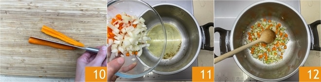 Faça o mesmo com a cenoura 10. Despeje mais um fio de azeite na mesma panela e adicione os legumes 11. Deixe-os refogar em fogo médio-baixo 12.