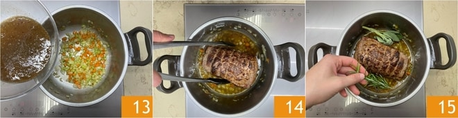 Despeje o fundo de cozimento que você reservou 13, coloque novamente o assado dentro 14 e adicione as ervas aromáticas 15.