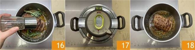 Adicione também uma pitada de sal e uma pitada de pimenta 16. Feche a panela de pressão 17 e cozinhe sempre em fogo médio-alto. Assim que entrar em pressão (você ouvirá um assobio contínuo), abaixe o fogo para médio e conte 20 minutos. Após esse tempo, desligue e deixe a panela despressurizar completamente. Assim que não estiver mais em pressão, você poderá abrir a tampa. O assado na panela de pressão está pronto 18!