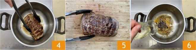 Doure bem de todos os lados, virando-o com pinças de vez em quando 4, tentando não furá-lo. Transfira-o para uma tábua de corte 5 e despeje o vinho branco na panela 6.