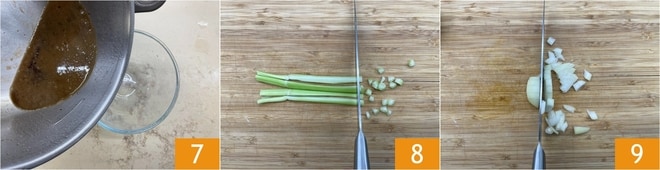 Deglace o fundo de cozimento e despeje o líquido em uma tigela 7. Pique grosseiramente o aipo 8 e a cebola 9.