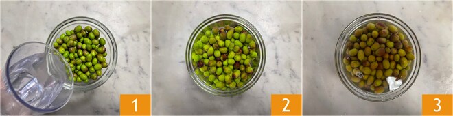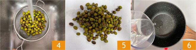 Escorra as azeitonas da água, enxágue-as 4 e coloque-as sobre um pano de algodão limpo para secá-las 5. Prepare a salmoura despejando água em uma panela 6.