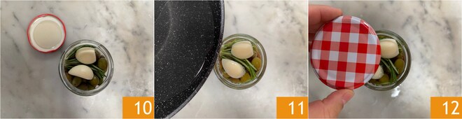 Tempere com alho e alecrim 10 e, assim que a salmoura estiver fria, despeje-a sobre as azeitonas 11. Feche com a tampa 12 de cada pote e guarde em um local fresco, seco e longe da luz. Deixe suas azeitonas em salmoura ganharem sabor por pelo menos um mês antes de consumi-las.