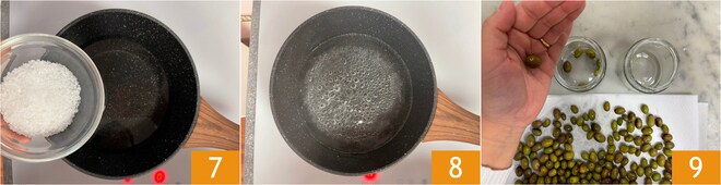 Adicione também o sal 7 e leve à fervura 8. Quando a salmoura estiver fervendo, desligue o fogo e deixe esfriar. Distribua as azeitonas nos potes de vidro esterilizados 9 de acordo com as diretrizes ministeriais que estão no final da receita.