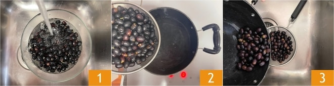 Para preparar as azeitonas pretas assadas, escolha azeitonas bem maduras, de preferência aquelas que já caíram da árvore, mas que não apresentam imperfeições. Lave muito bem as azeitonas 1 para eliminar qualquer resíduo de sujeira ou terra. Encha uma panela com água e coloque no fogo, assim que ferver, mergulhe as azeitonas 2 e cozinhe-as por cerca de 5 minutos, depois escorra-as 3.