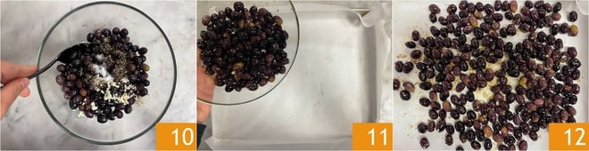 Misture bem 10, depois despeje-as em uma assadeira forrada com papel manteiga 11 e leve ao forno pré-aquecido a 160°C por cerca de 35/40 minutos. Assim que estiverem prontas, retire as azeitonas do forno e deixe-as esfriar completamente 12. Regue novamente as azeitonas com um pouco de azeite para amaciá-las antes de servir.