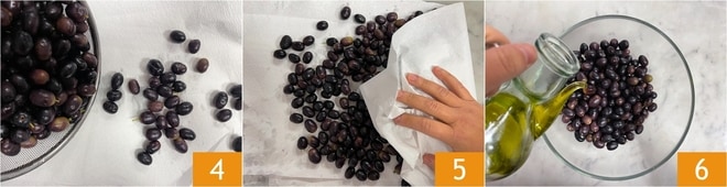 Transfira as azeitonas para um pano de prato 4 e seque-as bem 5. Coloque-as em uma tigela e tempere com um fio de azeite 6.