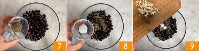 Adicione duas colheres de sopa de orégano 7, uma pitada de sal 8 e dois dentes de alho picados 9.