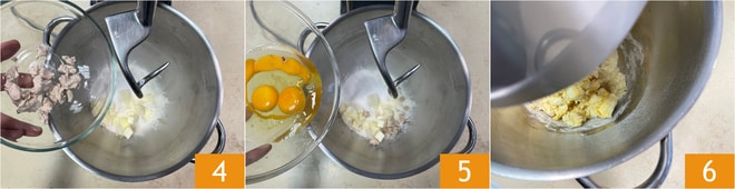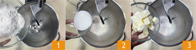 Para preparar o babá, você deve colocar 3 ovos no freezer na noite anterior: recomendamos descascá-los e colocá-los em forminhas de silicone, para que sejam mais fáceis de retirar depois. A manteiga e os ovos restantes devem estar frios de geladeira. Despeje em uma batedeira a farinha 1, juntamente com o açúcar 2 e a manteiga fria de geladeira cortada em pedaços 3.