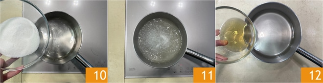Enquanto isso, você pode preparar a calda, que precisa de mais tempo de descanso, e que será utilizada para molhar os babás antes de servi-los. Despeje a água e o açúcar em uma panela 10 e leve para ferver. Desligue e deixe esfriar completamente. Somente quando estiver fria, você pode adicionar o rum a 70° 12. Mantenha a calda reservada, na geladeira e coberta com filme plástico.