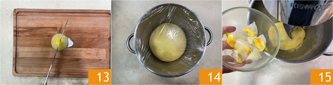 Enquanto isso, retome a preparação da massa: retire os 3 ovos do freezer e divida-os em partes, de modo a adicioná-los à batedeira aos poucos 13. Nesta fase, é preciso ter muita paciência: insira na batedeira a massa que dobrou de volume 14, depois comece a bater em velocidade baixa e depois média-baixa. Insira um pedaço de ovo congelado de cada vez para que ele seja completamente absorvido antes de adicionar outro 15.