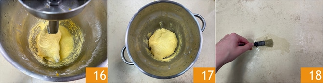 Levará pelo menos 30-40 minutos para que todos os ovos sejam totalmente incorporados 16, recomendamos não ter pressa nesta fase. No máximo, ocasionalmente, pode-se aumentar a velocidade da batedeira, mas a massa não deve aquecer excessivamente, caso contrário, a rede de glúten não se formará adequadamente. Uma vez que a massa esteja pronta 17, unte as forminhas com capacidade de cerca de 70 g, depois unte levemente a bancada de trabalho 18.