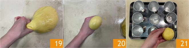 Despeje a massa sobre a bancada de trabalho, faça apenas algumas dobras de reforço e, então, para fazer uma pequena porção de cerca de 30-40 g de cada vez, puxe uma extremidade da massa com uma mão 19 e aperte para que ela saia entre o indicador e o polegar, com a mão fechada 20. Coloque cada pedaço nas forminhas untadas, que você terá colocado em uma assadeira 21.