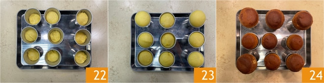 Com estas quantidades, você obterá 10-12 babás 22. Você deve deixá-los crescer sem cobri-los, em forno desligado com a luz acesa (cerca de 26°) até que ultrapassem a borda do molde 23. Asse em forno estático pré-aquecido a 200°, por cerca de 15-20 minutos. Lembre-se de que cada forno é diferente, então você pode ajustar melhor os tempos com uma primeira fornada de 2-3 babás para conhecer melhor os tempos para os próximos. Após assados, deixe esfriar em temperatura ambiente 24, depois desenforme e deixe secar ao ar livre por até 24 horas.