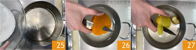 Para fazer o ponche que será usado para mergulhar os babás, despeje água e açúcar em uma panela grande 25 e leve para ferver. Desligue e aromatize com casca de laranja 26 e limão 27.