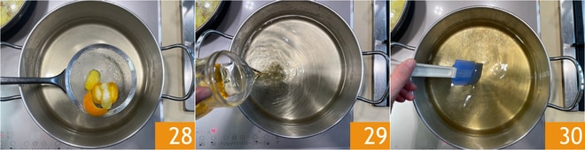 Quando o xarope estiver morno, retire as cascas 28 e despeje o rum a 70° 29, depois misture 30.