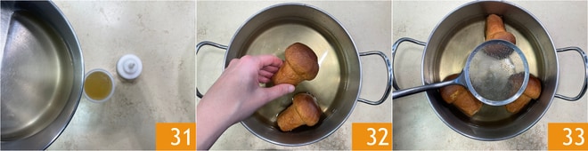 Transfira a calda que você preparou anteriormente para uma garrafinha 31. Mergulhe os babás no ponche 32 e deixe-os de molho por 2-3 minutos 33.