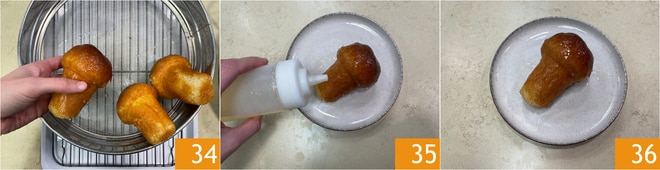 Esprema ligeiramente os babás e coloque-os para escorrer sobre uma grade, sob a qual você terá colocado uma bandeja para recolher o líquido em excesso 34. Antes de servir, regue cada babá com a calda preparada 35 e estará pronto para ser degustado 36!