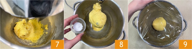 Adicione o sal sempre com a batedeira em funcionamento 7, depois amasse por mais 5-10 minutos. Uma vez que a massa estiver formada 8, retire-a do gancho e dê-lhe uma forma esférica, então cubra com filme plástico e deixe crescer por cerca de 2 horas, longe de correntes de ar. Ela deve dobrar de volume.