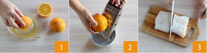 Para preparar o bacalhau à laranja, primeiramente esprema o suco de laranja 1 e rale a casca 2. Pegue o bacalhau dessalgado e corte-o em quatro partes 3.