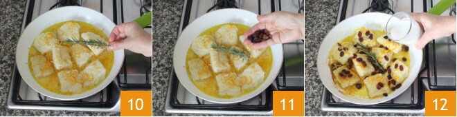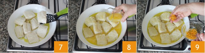 Coloque os pedaços de bacalhau 7 e doure por 3 minutos em fogo médio, depois vire-os e cozinhe por mais 3 minutos. Refresque com o suco de laranja 8 e aromatize com a casca que você ralou 9.