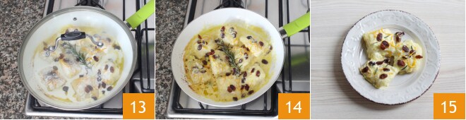 Tempere com um ramo de alecrim 10, salgue e adicione as passas 11. Continue cozinhando para reduzir o molho em fogo médio por cerca de 3 minutos, em seguida, adicione o creme de leite 12.