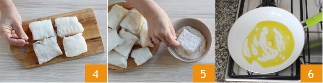Remova eventuais espinhas com uma pinça de cozinha 4. Neste ponto, enfarinhe o bacalhau de todos os lados 5. Em uma frigideira, aqueça o óleo com um dente de alho 6.