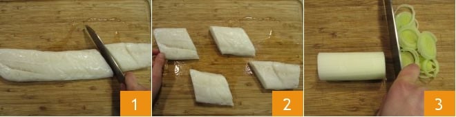 Para preparar o bacalhau no forno, primeiro corte o filé de bacalhau (já dessalgado) em quatro pedaços (1-2). Lave e fatie o alho-poró 3.