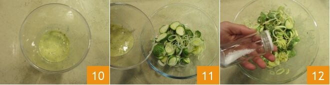 até obter um molho liso e homogêneo 10. Em uma tigela, misture o alho-poró com as couves-de-bruxelas e tempere com parte da emulsão 11; ajuste o sal com moderação 12, considerando que o bacalhau, mesmo dessalgado, será bastante salgado.