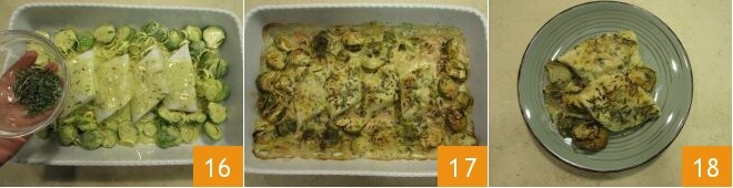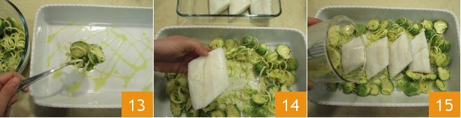 Em uma assadeira levemente untada com óleo no fundo, despeje o acompanhamento já temperado 13 e coloque os filetes de bacalhau no centro 14, regando-os com a emulsão restante 15.