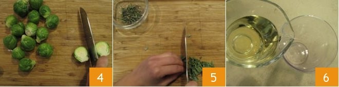 Lave as couves-de-bruxelas, elimine as folhas mais externas se estiverem um pouco danificadas, e então corte-as ao meio 4. Pique finamente a sálvia e o alecrim 5. Reserve esses ingredientes e prepare o molho: em um copo alto, despeje o vinho branco 6,