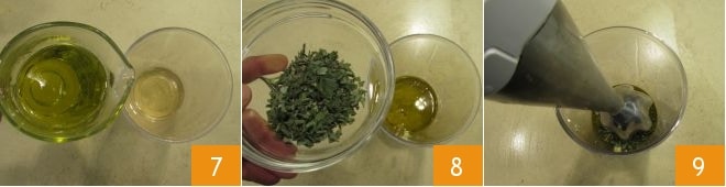a mostarda, o azeite de oliva 7 e metade das ervas picadas previstas na receita 8. Misture tudo com um mixer de imersão 9