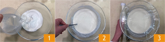 Para preparar o bacalhau em tempura com brócolis, a primeira coisa a fazer é preparar a massa. Em uma tigela, coloque a farinha, a farinha 00 e a água com gás gelada 1. Misture com um garfo 2 e não se preocupe se não estiver perfeitamente lisa 3. Cubra com filme plástico e coloque na geladeira por cerca de 30 minutos, ou pelo tempo necessário para continuar com outras preparações.