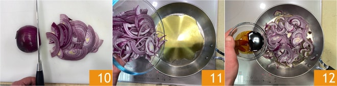 Prepare também as cebolas caramelizadas. Descasque e corte-as em fatias 10. Coloque-as em uma panela com óleo 11 e adicione o vinagre balsâmico 12.